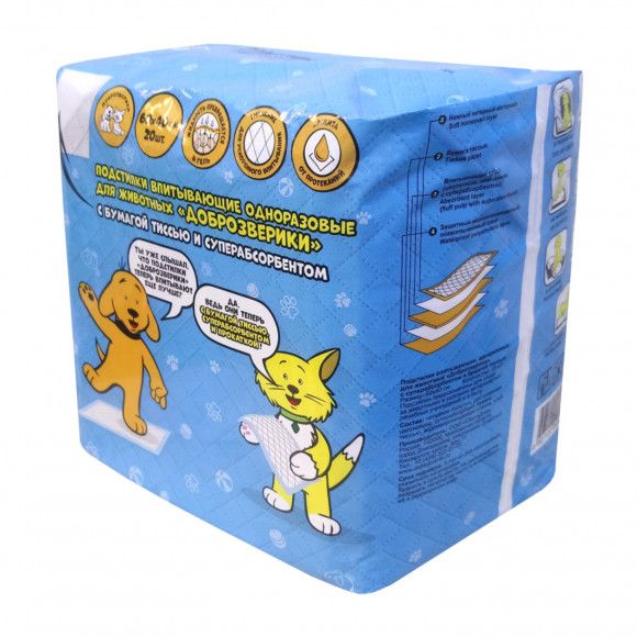 Подстилки впитывающие для животных Доброзверики с бумагой тиссью и суперабсорбентом 60х40 см, (1 шт)