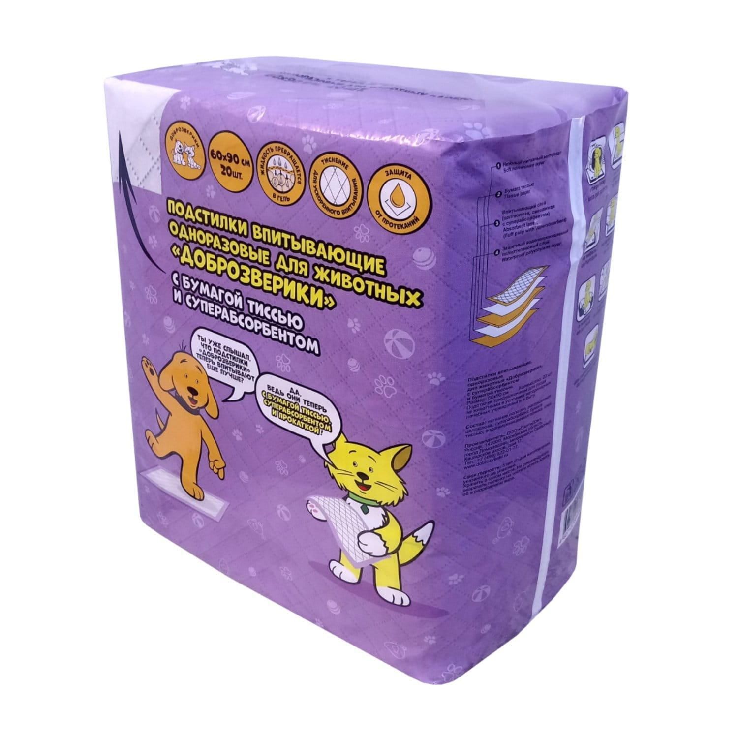 Подстилки впитывающие для животных Доброзверики с бумагой тиссью и суперабсорбентом 60х90 см, (1 шт)