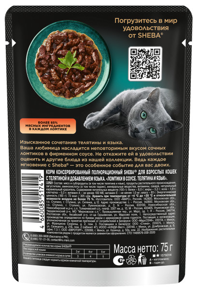 Влажный корм для кошек Sheba Ломтики в соусе с телятиной и языком 75 г