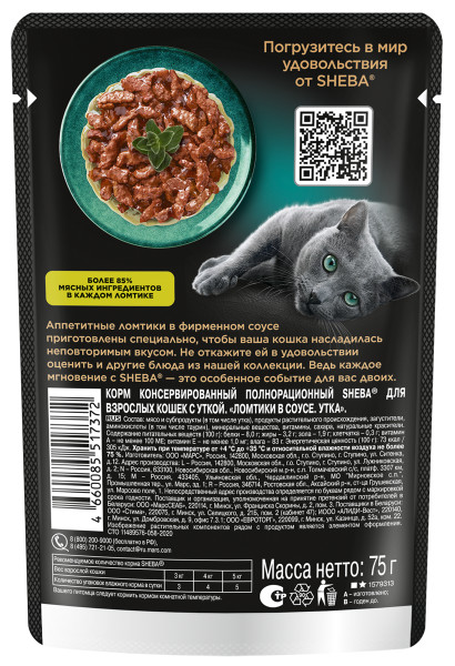 Влажный корм для кошек Sheba Ломтики в соусе с уткой 75 г