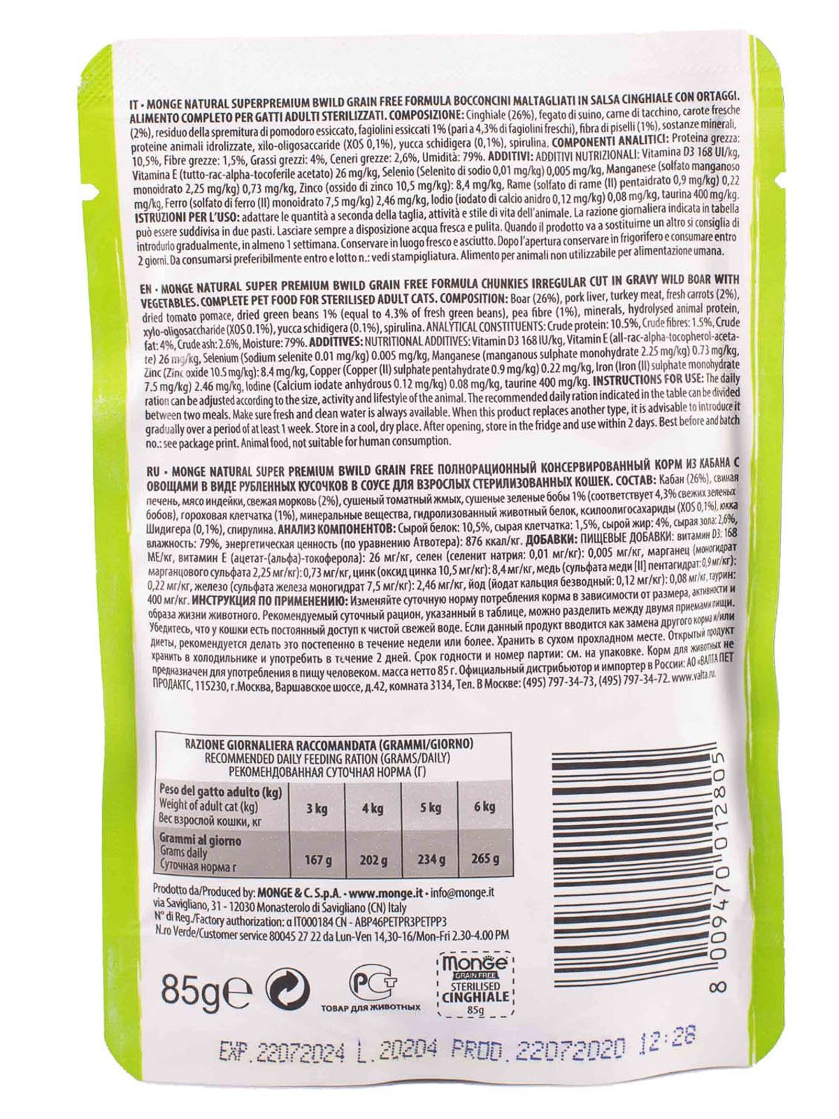 Влажный корм для стерилизованных кошек Monge Cat Bwild Graifree дикий кабан/овощи 85 г