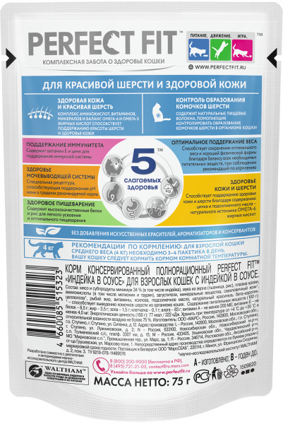 Влажный корм для взрослых кошек для красивой шерсти и здоровой кожи с индейкой в соусе 75 г