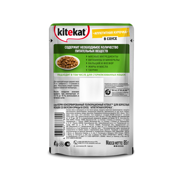 Влажный корм для взрослых кошек Kitekat «Аппетитная курочка» со вкусом курицы в соусе 85 г