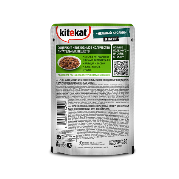 Влажный корм для взрослых кошек Kitekat «Нежный кролик» со вкусом кролика в желе 85 г