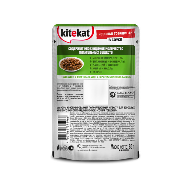 Влажный корм для взрослых кошек Kitekat «Сочная говядина» со вкусом говядины в соусе 85 г