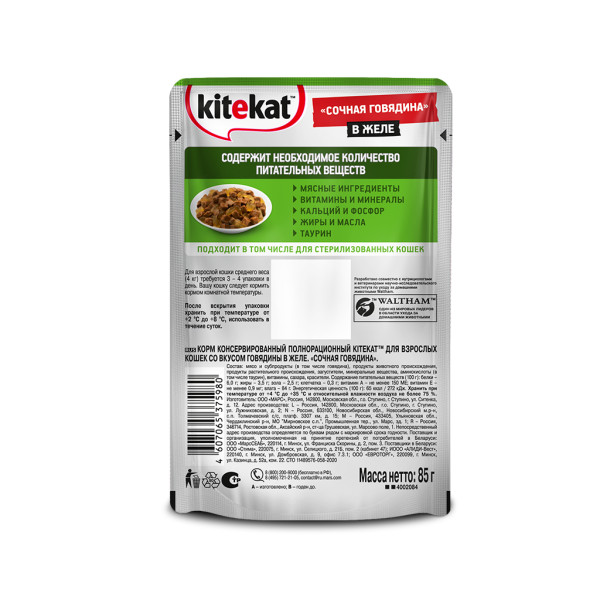 Влажный корм для взрослых кошек Kitekat «Сочная говядина» со вкусом говядины в желе 85 г